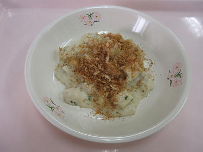 ささみは多めの油で揚げ焼きにすると手軽です。給食ではキャベツの炒め物を添えましたが、ご家庭ではキャベツやレタスなどでも。タレが多めなので、野菜も一緒に食べられます。