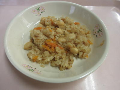 3.ツナ(油ごと加える)・大豆・にんじんをのせて炊く。炊き上がったら、全体をよく混ぜ合わせる。